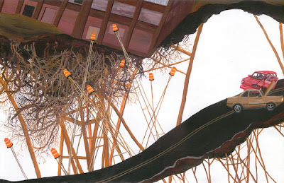 Πρόσφατα είχα την τύχη να συναντήσω διαδικτυακά δύο νεαρές ζωγράφους. Η Amy Casey αμερικανίδα από το Cleveland ζωγραφίζει σπίτια. Σπίτια εύθραυστα χωρίς θεμέλια, σπίτια που αιωρούνται δεμένα με σχοινιά σαν χαρταετοί, σπίτια χωρίς απόσταση ασφαλείας το ένα από το άλλο ή το ένα πάνω στο άλλο, σπίτια αναποδογυρισμένα, σπίτια πάνω σε ξυλοπόδαρα και εξαρθρωμένες λεωφόρους.Μικρές πόλεις που κινδυνεύουν δεμένες στην αβεβαιότητα και τυλιγμένες με κινδύνους.Η ίδια λέει ότι η εργασία της είναι μια αντανάκλαση του άγχους που υπάρχει στον κόσμο σήμερα. Η ζωγραφική της δημιουργεί προβληματισμό και αναζητεί λύσεις θα πω εγώ, σχηματίζει επιπλέον εικόνες και όλες αφορούν την σύγχρονη κοινωνία και τα θέματα που αντιμετωπίζει ή θα κληθεί να αντιμετωπίσει στο άμεσο μέλλον.